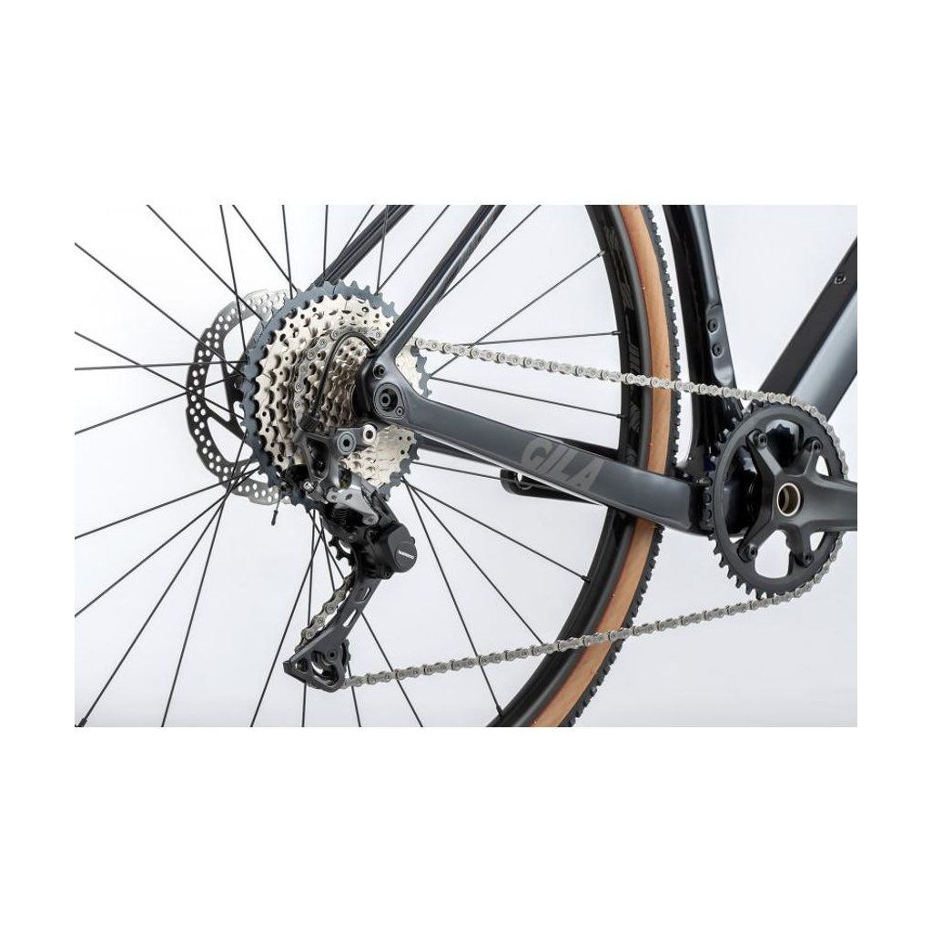 Gravel Apache Gila 5 je postavena na karbonovém rámu a vidlici. Dále je vybavena pohonem Shimano GRX 1x11, kotoučovými brzdami a koly o průměru 28 palců..