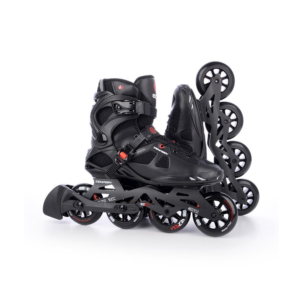 U bruslí je použita TEMPISH brzda univerzální „S“. Brzda je přiložena v krabici společně se 4-mi šroubky – velmi jednoduchá montáž – bez nutnosti demontovat osky a kolečka. Materiál držáku brzdy – nylon se skelným vláknem – velmi tuhý a pevný, který umožňuje nastavit výšku špalku. Materiál špalku TPR. Brusle EZZA 90 jsou osazeny kolečky ze serie RADICAL, PU casting (PUC), Super Hi-Rebound (SHR). Jedná se o vysoce kvalitní kolečka s velmi nízkým valivým odporem a dlouhou životností, které dosahují velmi nízkého opotřebení na různých površích a výborně tlumí nerovnosti povrchu což zaručuje opravdu komfortní jízdu. Kolečka jsou osazena ložisky ABEC 9 hi-precision s gumovou prachovkou. Šněrování je klasické tkaničkami. Přes nárt je umístěn zpevňující pásek s mikropřezkou.