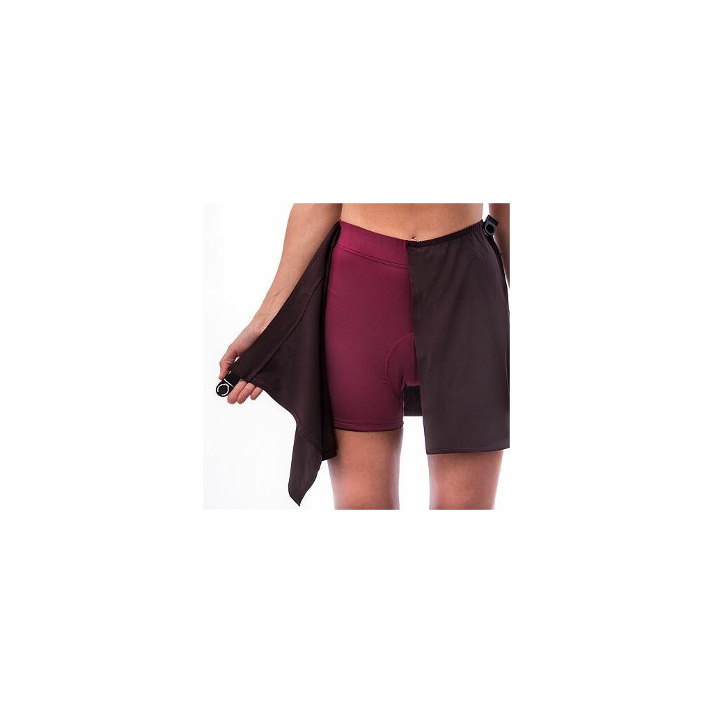 Cyklistická sukně s všitými elastickými cyklokalhotami. Sukně je vyrobena z pevné tkaniny odolné proti oděrkám a využívá rychlé zapínání v pase pomocí plastové spony. Vnitřní kalhoty jsou pevně spojeny se sukní a obsahují T.M.F. cyklovložku pro větší pohodlí. Superrychlý odvod vlhkosti od pokožky a ochrana UPF25 proti UV záření. Ionty stříbra zamezují zápachu a tvoří trvalou antibakteriální ochranu. Sukně je zdobena odolným, decentním potiskem.