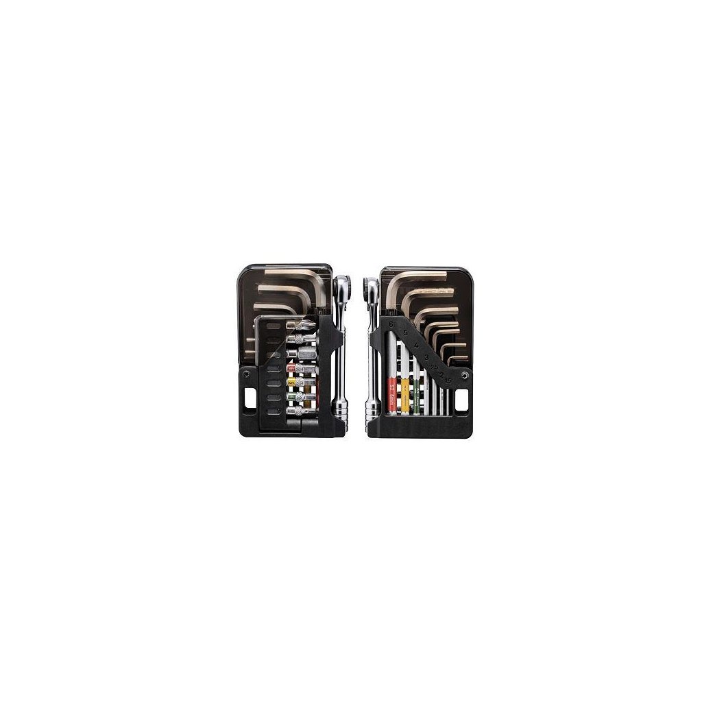 Neuvěřitelně kompaktní sada nářadí s ráčnou, bity a inbusovými klíči s kulovým koncem. Sedm ráčnových bitů a sedm inbusových klíčů s kulovým koncem je uloženo v inovativním skládacím těle organizéru, které je dostatečně malé, aby se vešlo do kapsy na dres nebo do sedlové tašky.